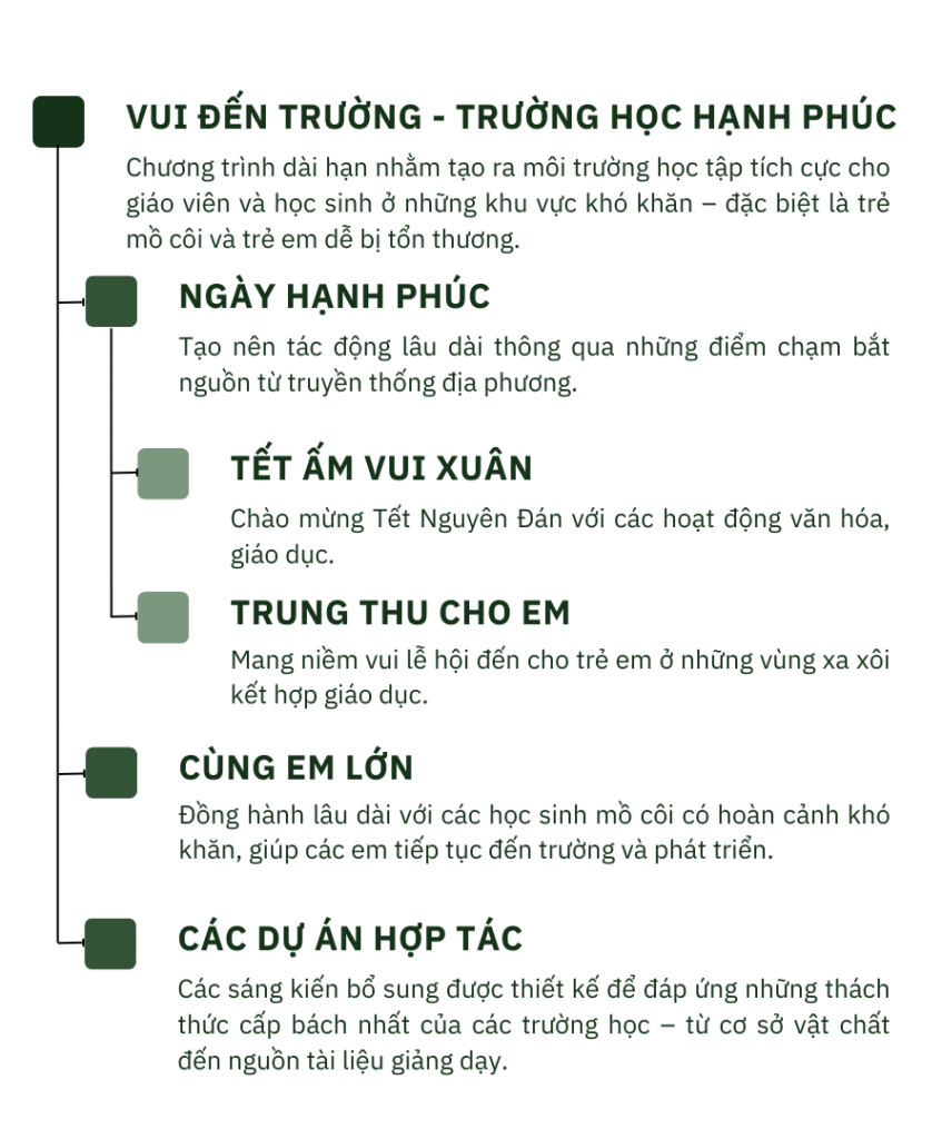 Vui Đến Trường là chương trình dài hạn nhằm tạo dựng môi trường học tập tích cực cho học sinh và thầy cô ở vùng khó khăn – đặc biệt là trẻ mồ côi và trẻ dễ bị tổn thương.