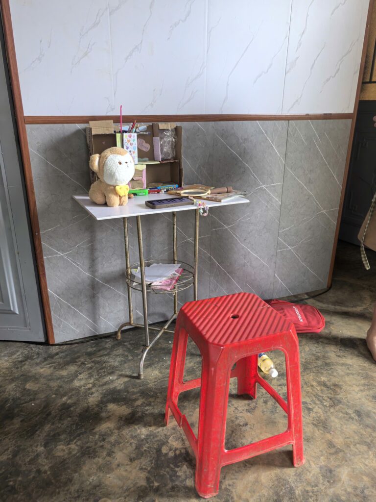 Bàn học, kệ sách (lắp ghép), hoặc bàn ăn, bàn xếp, ghế