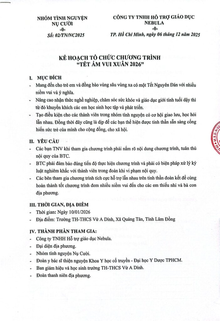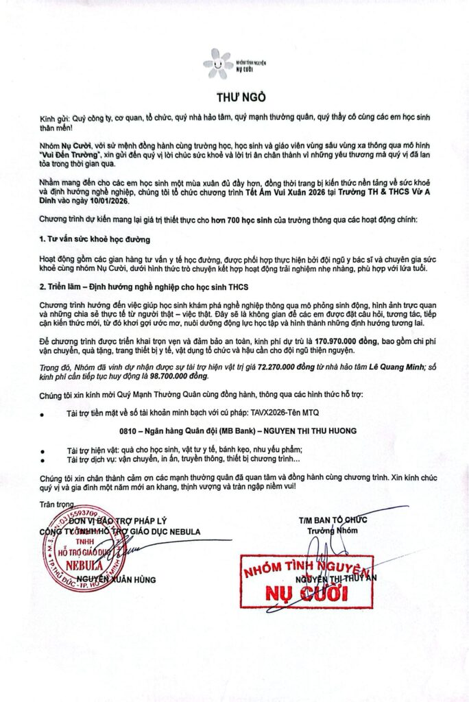 Nhằm mang đến cho các em học sinh một mùa xuân đủ đầy hơn, đồng thời trang bị kiến thức nền tảng về sức khoẻ và định hướng nghề nghiệp, chúng tôi tổ chức chương trình Tết Ấm Vui Xuân 2026 tại Trường TH & THCS Vừ A Dính vào ngày 10/01/2026.
